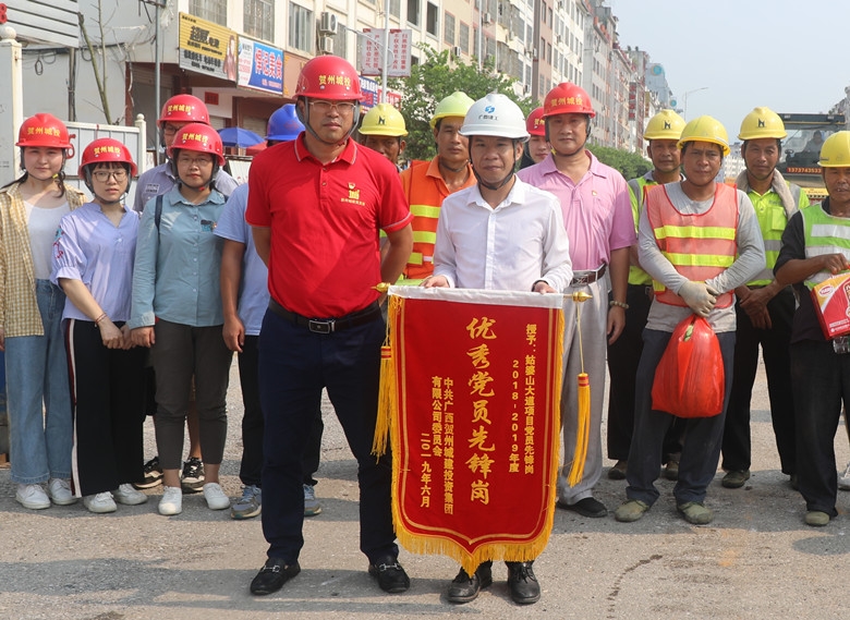 在項(xiàng)目現(xiàn)場(chǎng),蘭乾雄為戰(zhàn)斗在一線的工人們發(fā)放了西瓜、清涼飲料,并與工人代表拉起了家常,一一詢問了工人的家庭、收入及工資發(fā)放等情況。他說到,正是因?yàn)橛幸痪€工人們的努力和堅(jiān)守,我們的一些重點(diǎn)工程和項(xiàng)目才能順利向前推進(jìn),他們是最值得尊敬的人。同時(shí),蘭乾雄為姑婆山大道項(xiàng)目頒授了“2018-2019年度優(yōu)秀黨員先鋒崗”旗幟,肯定了他們?yōu)轫?xiàng)目建設(shè)的付出,鼓勵(lì)他們繼續(xù)充分發(fā)揮黨員先鋒崗先鋒模范作用。